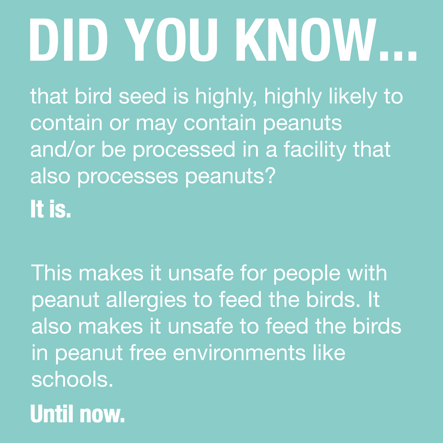 This makes bird seed (except for ours!) unsafe for people with peanut allergies to use or be around.