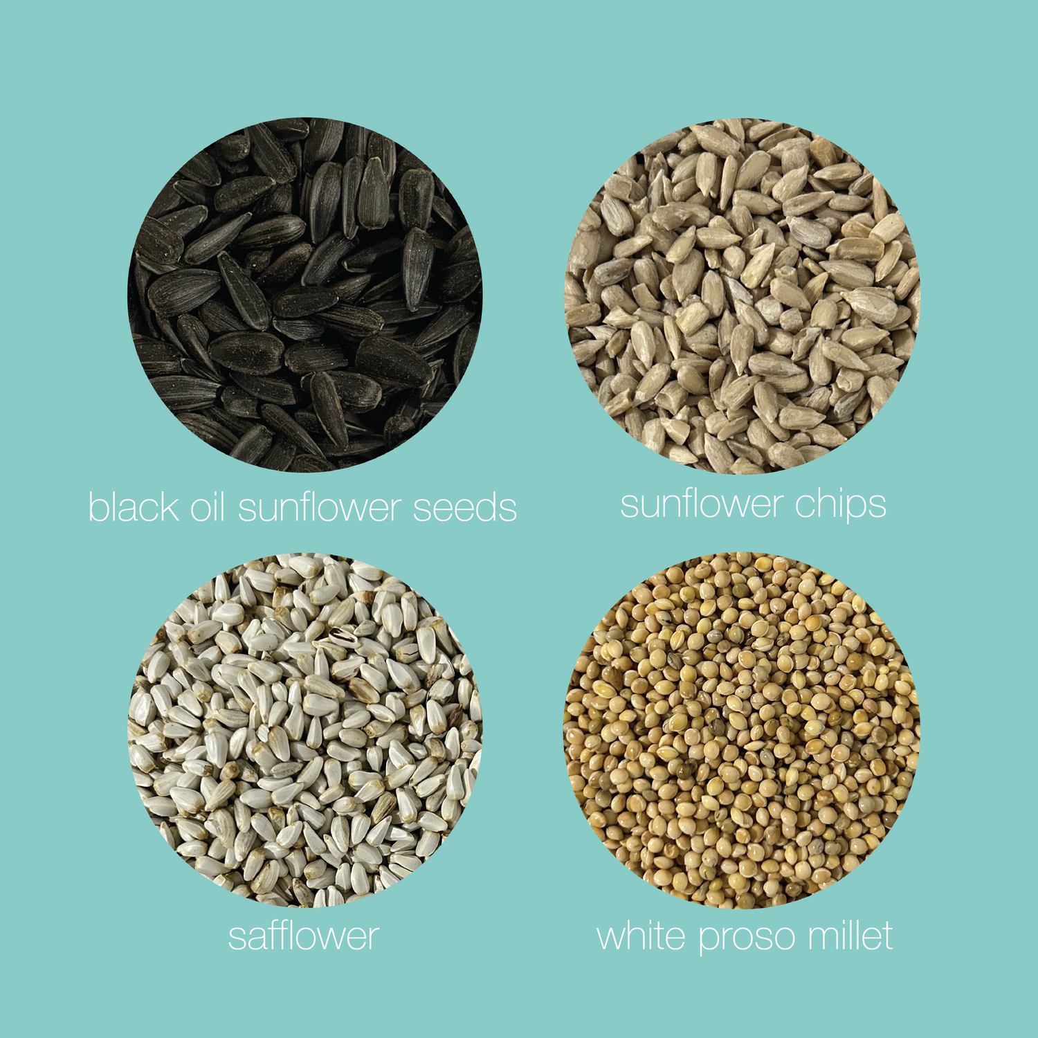 Our blends contain only premium seeds that all the backyard seed-eating birds truly love (no fillers, ever). These are black oil sunflower seeds, sunflower chips, safflower seeds and white proso millet. Some birds love one of these over the other, but there’s something for everyone.